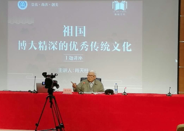 2017年11月28日,海南师范大学中文系原主任、国学研究专家肖天柱教授来到海经贸,为广大师生作“祖国,博大精深的优秀传统文化”专题讲座。他从学习中华传统文化的意义、传统文化“博大精深”的内涵、“优秀传统文化”概念的理解和如何学习践行中华精神四个方面向师生阐述了中华优秀传统文化之“美”。肖教授的讲解旁征博引、谈笑风生、引人入胜,涵盖古今中外,既带领师生领略古时文化精髓,又带领师生展望中华民族伟大复兴之未来。