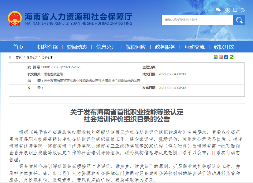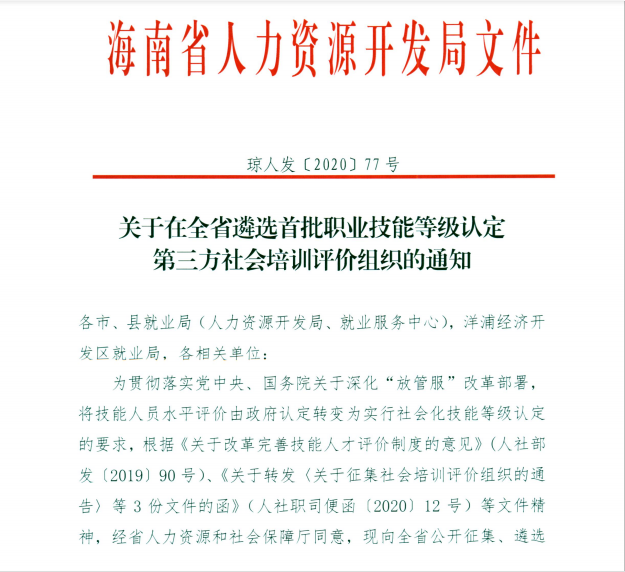 关于发布海南省首批职业技能等级认定社会培训评价组织目录的公告