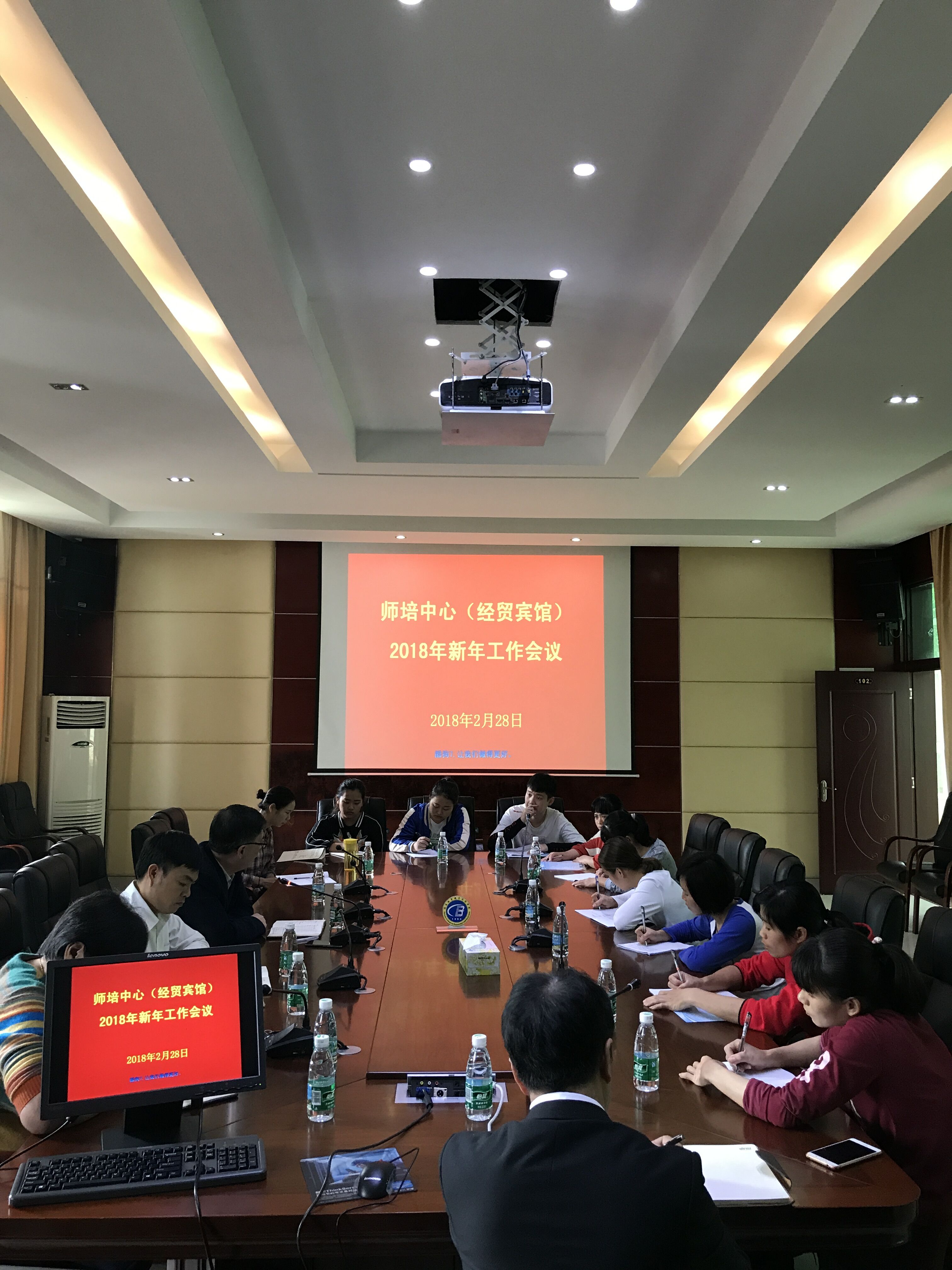 2018年2月28日,师培中心(经贸宾馆)召开2018年新年工作会议,会议传达了新学期学院中层干部会议的相关精神及指示,并部署了2018年的部门工作。毛江海主任、符以福副科长、刘小丽经理等全体部门员工参加了会议。毛江海主持会议。