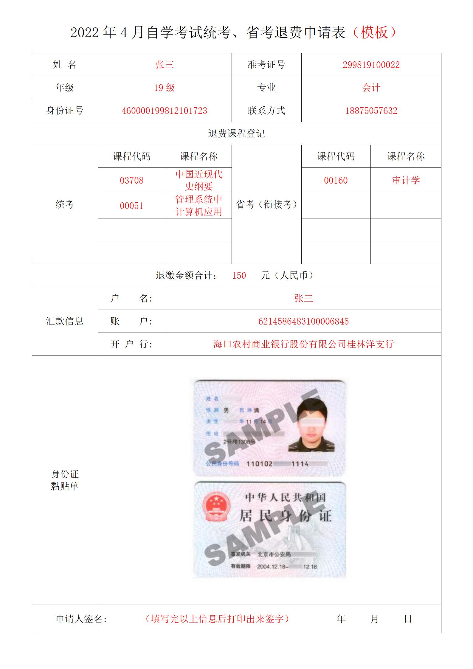 附件1:《2022年4月自学考试退费申请表》